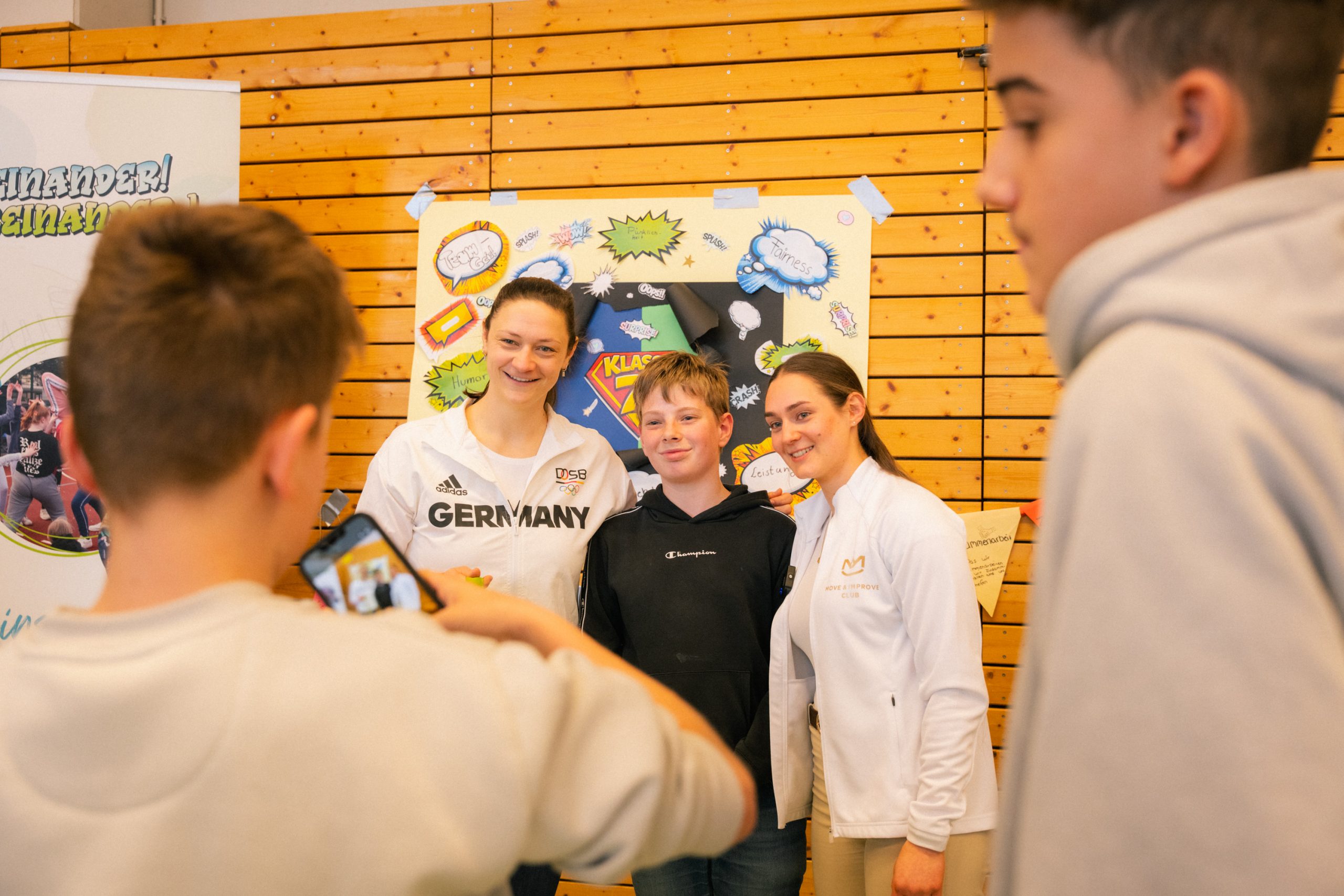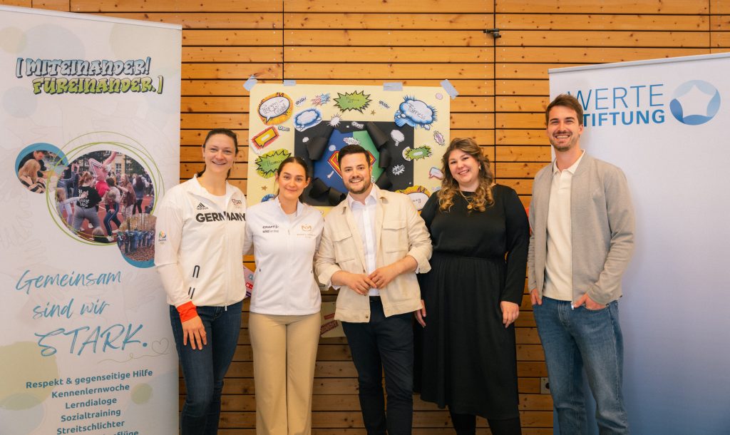 Aufbauend auf diesen Eindrücken entwickelten die Schülerinnen und Schüler eigene Vorstellungen davon, welche Werte ihnen persönlich wichtig sind und wofür sie als Klassengemeinschaft stehen möchten. Dieser Schritt ist entscheidend, denn Werte entfalten ihre Wirkung erst dann, wenn sie in konkretes Handeln übersetzt werden. Ein besonderes Highlight bildete der gemeinsame Projektabschluss: Die Jugendlichen präsentierten ihre Ideen zwei inspirierenden Persönlichkeiten aus dem Sport und kamen mit ihnen ins Gespräch. Mit Steffi Kriegerstein, Weltmeisterin und Silbermedaillengewinnerin bei den Olympischen Spielen 2016, sowie Helene Schäfer-Betz, Unternehmerin und ehemalige Leistungssportlerin, begegneten sie zwei authentischen Vorbildern. Beide berichteten offen von ihren eigenen Erfahrungen und machten deutlich, welche Rolle Werte wie Respekt, Disziplin, Gemeinschaft und Durchhaltevermögen auf ihrem persönlichen Weg gespielt haben. Gerade diese Begegnungen auf Augenhöhe sind es, die bei den Jugendlichen besonders nachwirken. Sie schaffen Identifikation, geben Orientierung – und können sogar dazu führen, dass junge Menschen erstmals ein echtes Vorbild für sich entdecken.